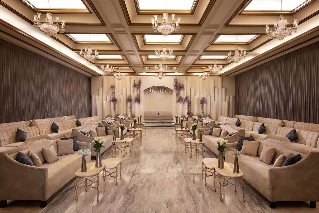 تعكس قاعات فندق شيراتون الرياض طابعاً فندقياً فخماً يلفت الانتباه من أول نظرة، حيث تظهر الأسقف العالية والثريات الكريستالية والتوزيع المدروس للجلسات والممرات الواسعة بشكل يمنح القاعة حضوراً راقياً ومريحاً في الوقت نفسه. ومن خلال تنوع التصاميم الظاهرة في القاعات، يتبين أن المكان قابل للتنسيق بأساليب مختلفة تناسب الأذواق المتنوعة، سواء كان المطلوب ستايل كلاسيكي هادئ بدرجات الكريم والذهبي، أو لمسات عصرية ناعمة بألوان أكثر حيوية وأناقة. كما أن شكل الكوشة ومنطقة الاستقبال ومسار الدخول يمنحان مساحة جميلة للتصوير ولدخول العروس بشكل مميز، مع إحساس عام بالفخامة والهدوء والتنظيم. لهذا تناسب ديكورات القاعات في شيراتون الرياض من يبحث عن قاعة زفاف في الرياض تجمع بين الفخامة، والمرونة في التصميم، والهوية الراقية التي تليق بالمناسبات الكبيرة والخاصة.
