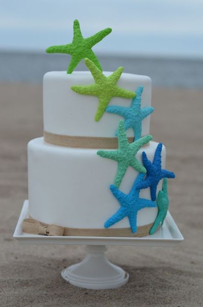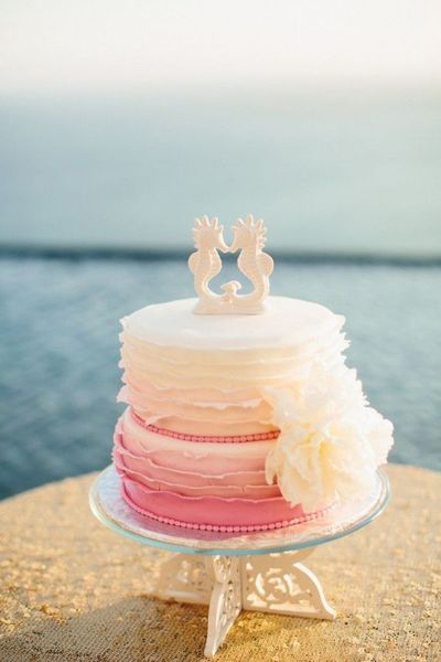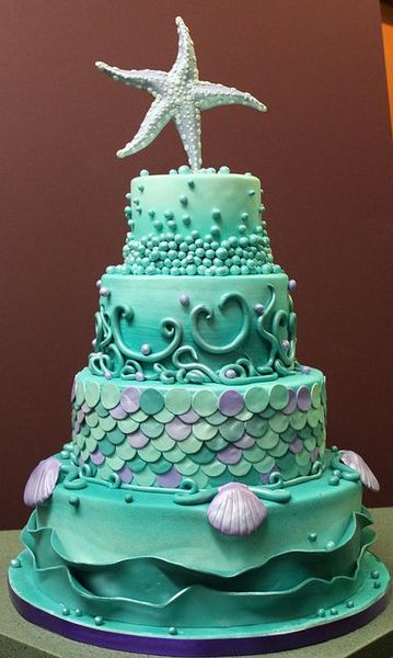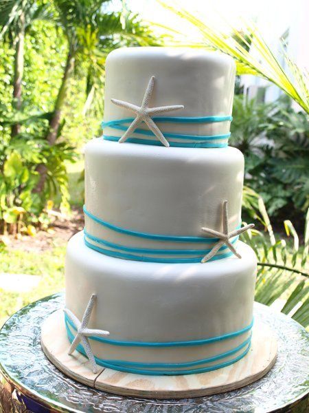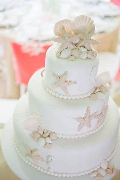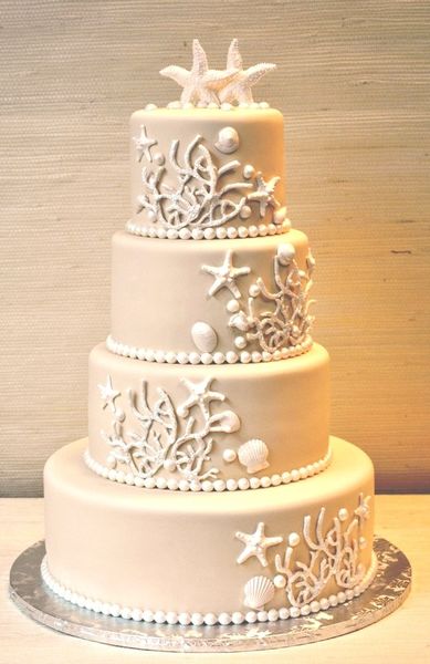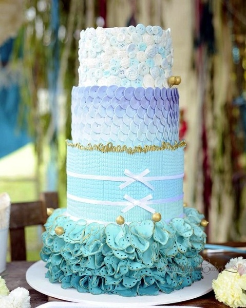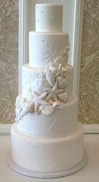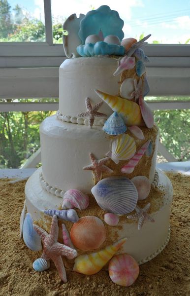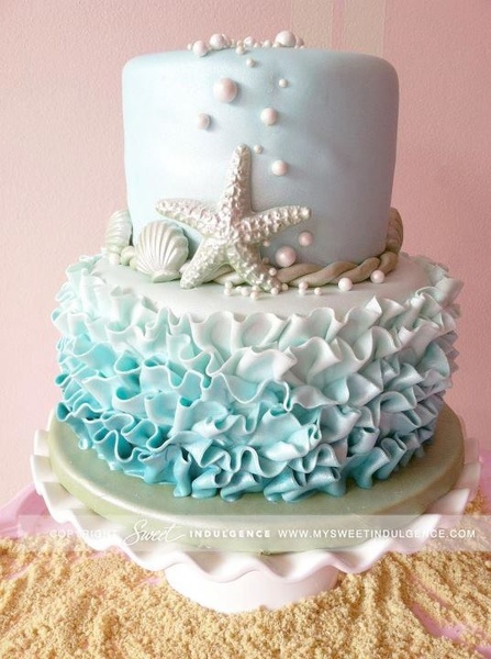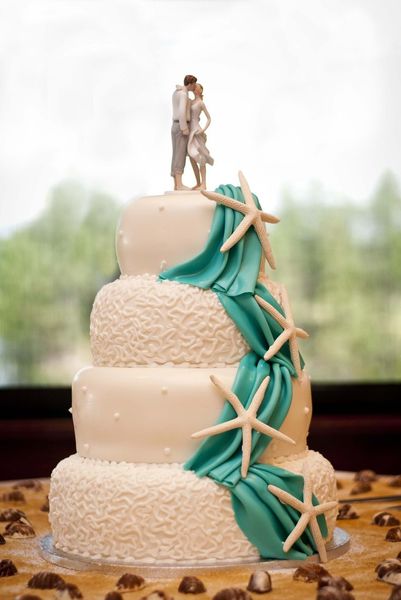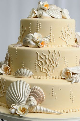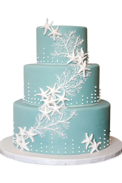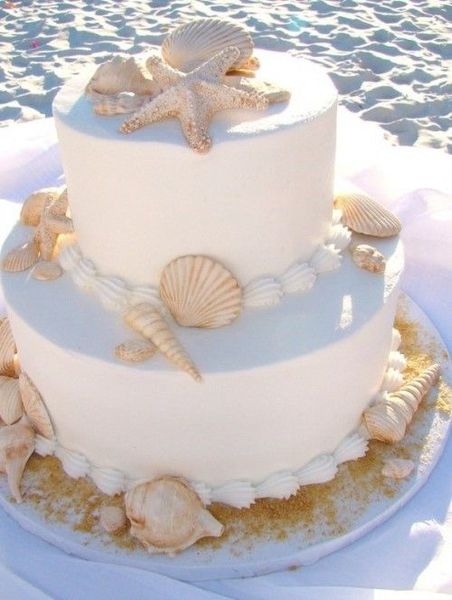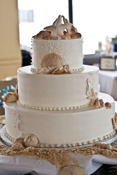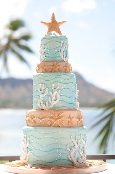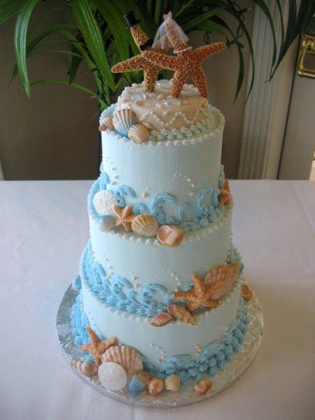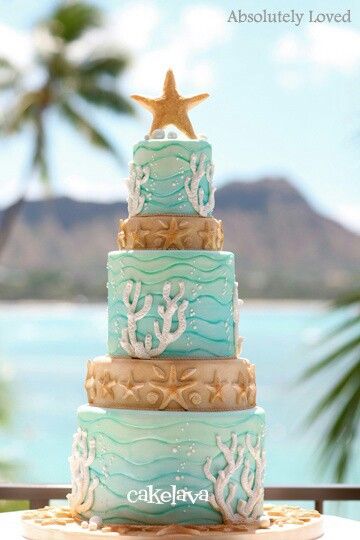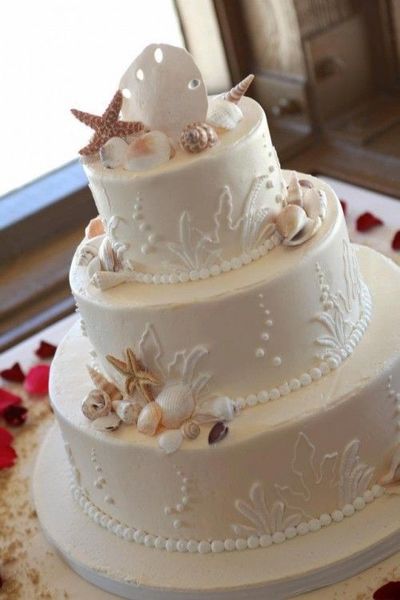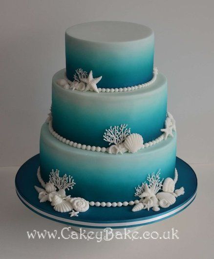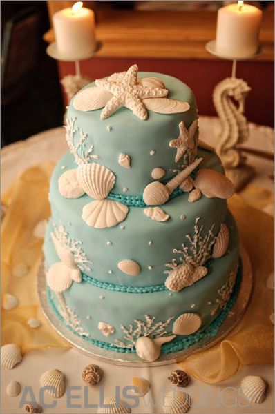 كيك زواج من أجواء البحر الأزرق، ونسيم البحر والشمس المشرقة على الشاطئ الرملي الممتد من أجواء الشاطئ ومزينة بالكريمة ذات اللون الأزرق السماوي مثل لون البحر وأشكال على شكل أصداف وقواقع بحرية مصنوعة من الكريمة
