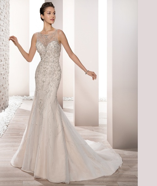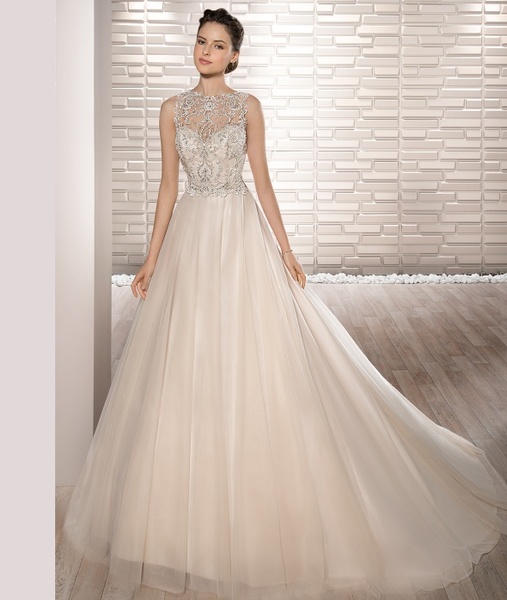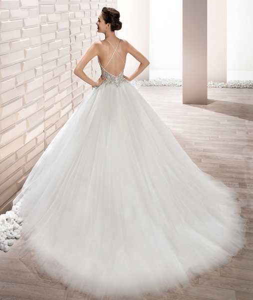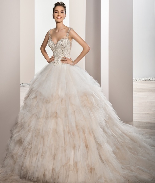 من مجموعة 2017 يأتي هذا الفستان من ديميتريوس بموديل منفوش من التول والدانتيل وقصة بدون حمالات يمنح كل عروس ذات جسم المثلث المقلوب الشكل المثالي الذي تطمح له