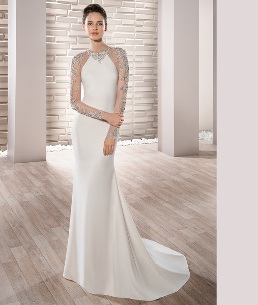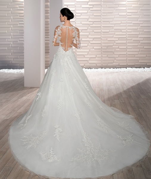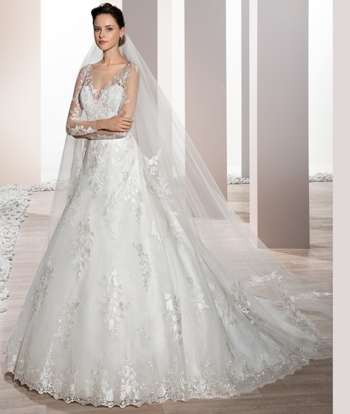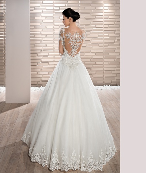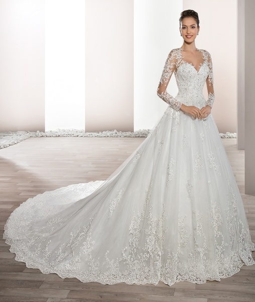فستان زفاف بقصة منفوشة قليلاً بشكل حرف A بقصة علوية واكمام طويلة من الدانتيل والتول وتنورة ناعمة من طبقات التول