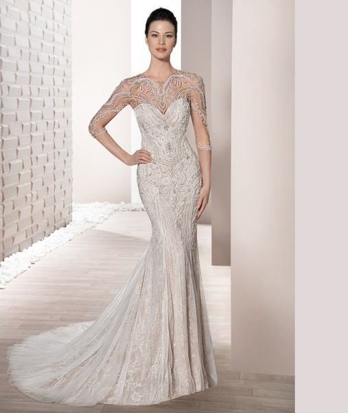 فستان زفاف من الدانتيل والتول الضيق المبطن بقصة ذيل السمكة ضيقة وقصة علوية بفتحة شكل حرف V وأكمام دانتيل ناعمة