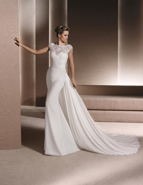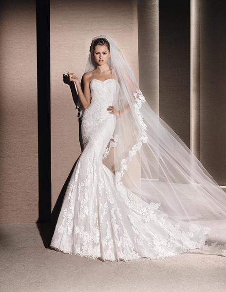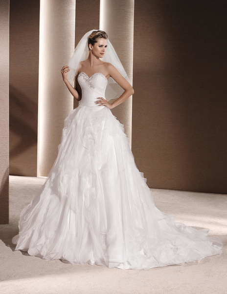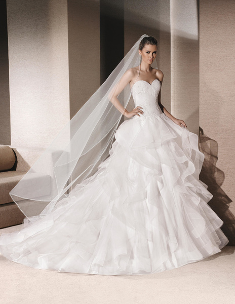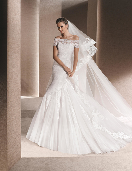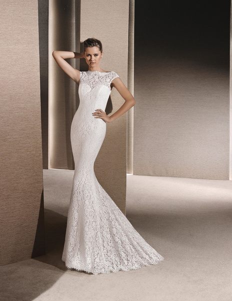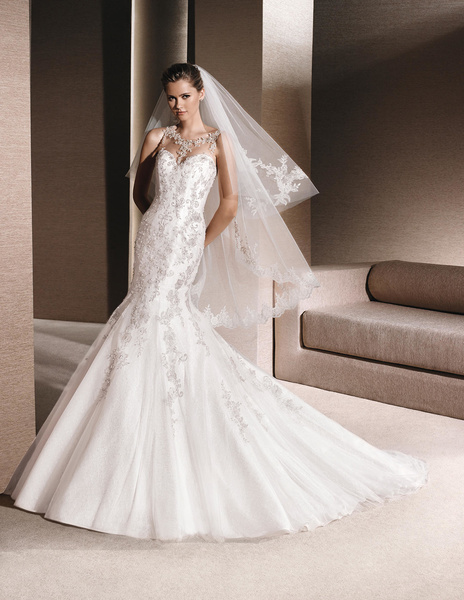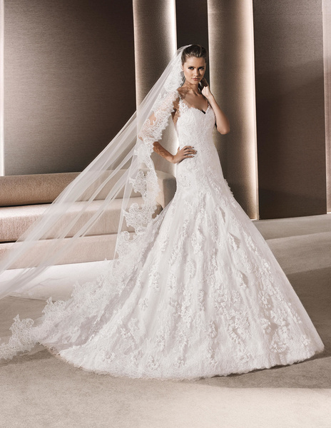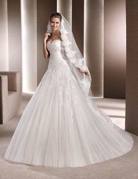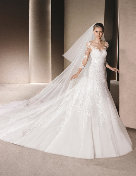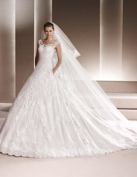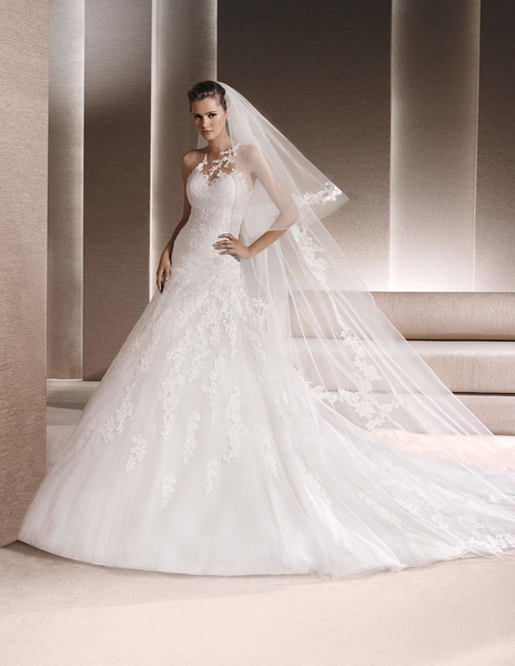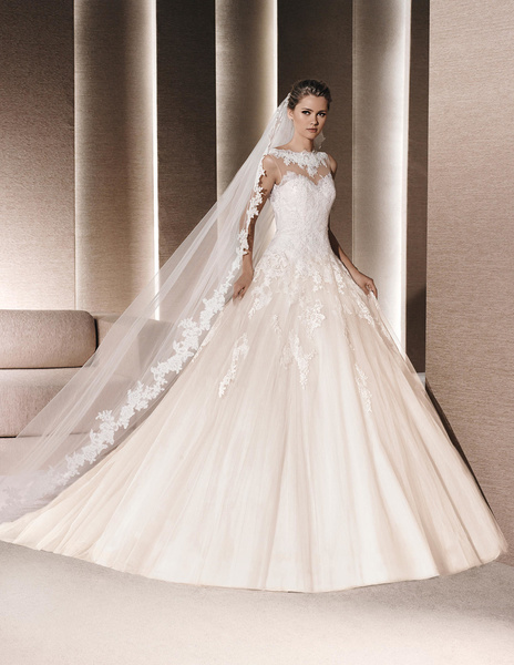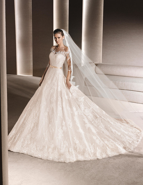 من مجموعة فساتين زفاف لا سبوزا لعام 2016 فستان زفاف بقصة علوية من الدانتيل وقصة رقبة ضيقة يليق معها تسريحة شعر مرفوع فخمة وموديل الفستان ذو التنورة المنفوشة يجعله يليق بالعروس ذات شكل الجسم المستطيل