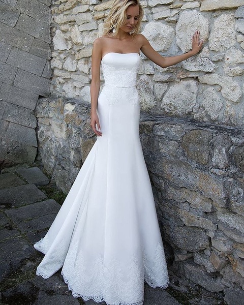 فستان زفاف ضيق من مزيج الساتان والدانتيل للعروس للعروس ذات الجسم المستطيل أو جسم الكمثري ليمنحها إطلالة الجسم المثالي