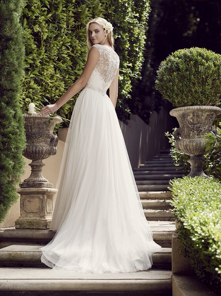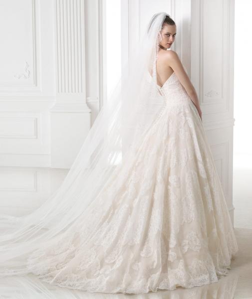 فستان زفاف بقصة ظهر خلابة من الدانتيل وتنورة من التول مع شاحط للعروس ذات الجسم الكمثري القصير لانه سمنحها شكل جسم أكثر جاذبية واكثر طولاً, مثالي مع تسريحة شعر مرفوعه ليظهر موديل ظهر الفستان.